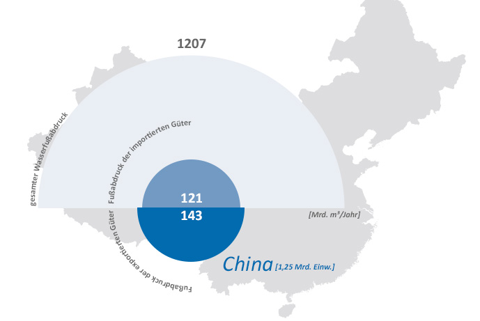 [5] In absoluten Zahlen weist China jedoch aufgrund seiner hohen Bevölkerungszahl den weltweit höchsten Wasserfußabdruck für Konsumgüter auf.