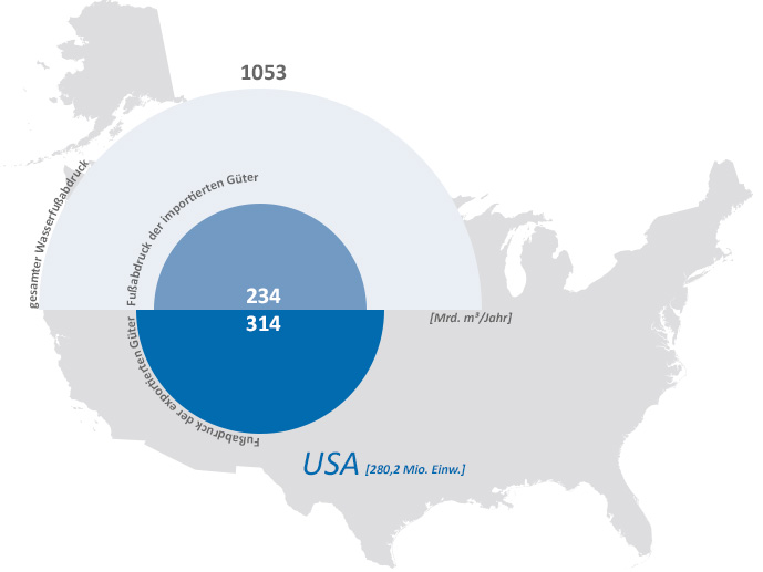 Die auf den 1. Blick ein wenig komplex wirkende Graphik soll anhand des Wasserfußabdrucks der USA in Abb. 7 verdeutlicht werden: Der untere (dunkelblaue) Halbkreis stellt den Wasserfußabdruck der exportierten Güter und Dienstleistungen (hier: 314 Mrd. m³/Jahr) dar. Gegenübergestellt wird ihm der Wasserfußabdruck der importierten Güter im mittelblauen oberen Halbkreis (hier: 234 Mrd. m³/Jahr). Der Gesamt-Wasserfußabdruck (1.053 Mrd. m³/Jahr) ist in leichtem hellblau jeweils über den oberen Halbkreis gezeichnet. Auf diese Weise lässt sich auf einen Blick erkennen, ob ein Land mehr export- oder importlastig ist und, in der maßstabstreuen Zusammenschau mit anderen Nationen, in welche Größenordnung der interne und externe Wasserfußabdruck sowie der Gesamt-Wasserfußabdruck eines Landes einzuordnen sind.