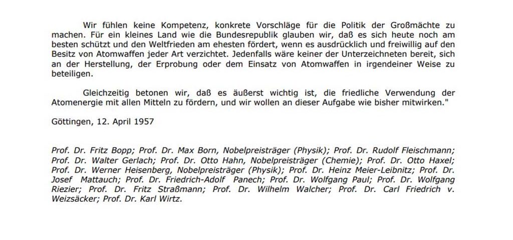 Vor 65 Jahren war das anders. Am 12. April 1957 veröffentlichten 18 führende deutsche Atomphysiker, unter der Führung von vier Nobelpreisträgern, eine Erklärung zu Plänen der damaligen Bundesregierung zur atomaren Bewaffnung der Bundeswehr. Damals waren die Erfahrungen von Hiroshima und Nagasaki und die des globalen II. Weltkriegs noch präsent.
