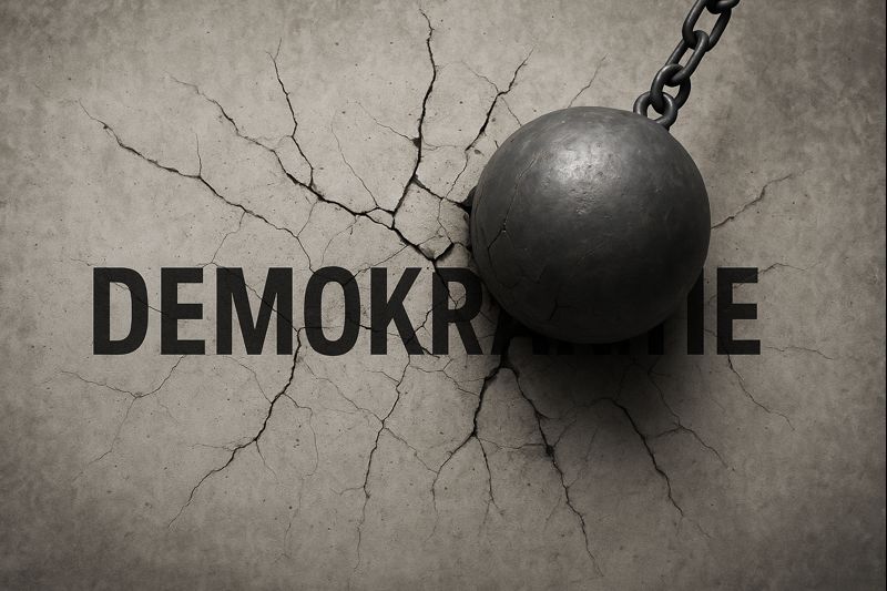 Eine Abrissbirne prallt auf eine Wand, auf der "DEMOKRATIE" steht. Es sind schon deutliche Risse zu erkennen. AI generiert