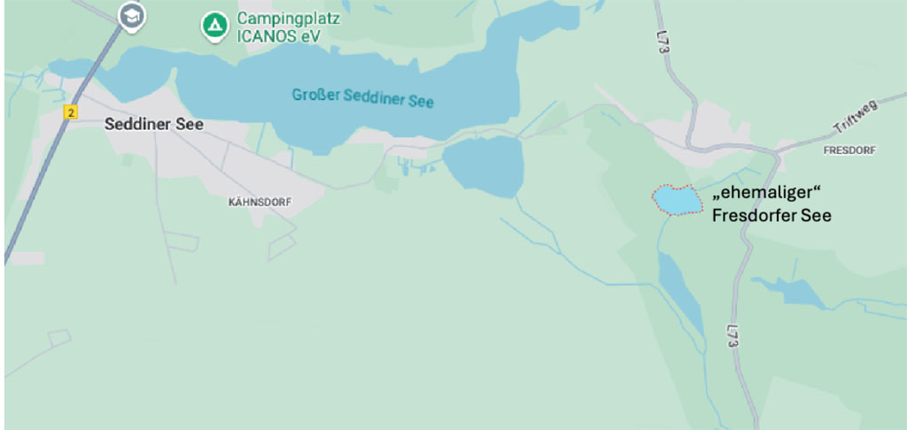 Was es bedeutet, wenn der Regen ausbleibt und ein See austrocknet, konnte ich in dem wenige Kilometern entfernt gelegenem Ort Fresdorf „besichtigen“. Der früher rund 400 Meter lange und 150 Meter breite Fresdorfer See ist vor vier Jahren ausgetrocknet. Mittlerweile ist das sieben Hektar große, morastige Gebiet völlig zugewachsen. „Die trockenen Jahre ab 2018 hat er nicht überlebt – die haben dem See das letzte Wasser genommen„, sagt Bernd Herrmann, Ortsvorsteher von Fresdorf. Jetzt gibt es dort nur noch einige Bodenlöcher in denen sich der Regen sammelt. Der See ist verloren.