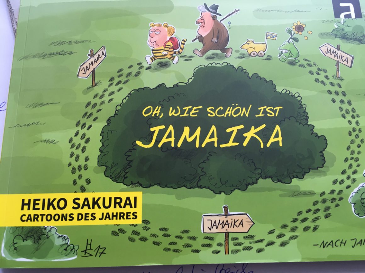 Oh, wie schön ist Jamaika, überschreibt Heiko Sakurai, einer der besten deutschen Karikaturisten, sein Cartoon-Buch des Jahres. In der Tat sah alles wochenlang so aus, als sei die Sonneninsel das Ziel deutscher Politik, als steuere Angela Merkel mit Horst Seehofer, Christian Lindner und den Grünen Cem Özdemir und Katrin Göring-Eckardt gerade auf Jamaika zu. Was der Zeichner zu der Zeit, als das Buch gedruckt wurde, nicht wissen konnte, dass Merkel den Hafen nie erreichte, sondern das Jamaika-Schiff durch Lindner zum Kentern gebracht wurde. Mit Cartoons und Sakurai durchs Jahr, das ist ein Spaziergang wie im Märchen, man schmunzelt, wie Politikerinnen und Politiker, allen voran die Kanzlerin, mit der Feder aufgespießt werden von Sakurai.
