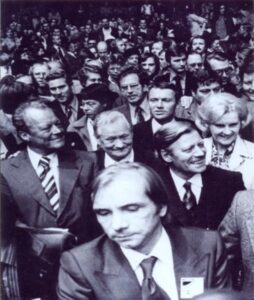 Willy Brandt und Helmut Schmidt in der Gruga-Halle in EssenWilly Brandt und Helmut Schmidt bei einer Wahlversammlung in der Essener Gruga-Halle. Im Vordergrund der Autor als Aushilfe bei den Sicherheitskräften.