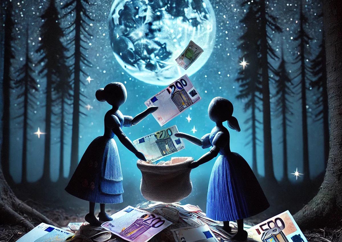2 Sterntalerammlerinnen, wobei die Sterntaler Euroscheine sind, AI generiert