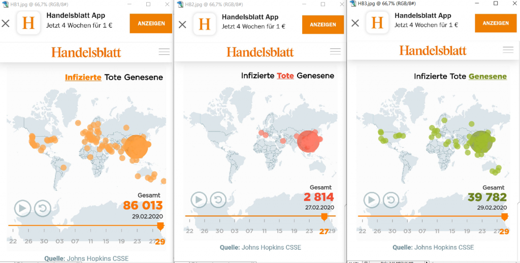 Angst ist – evolutionstheoretisch gesehen – ein sinnvoller Mechanismus. Sollen doch Emotionen uns Menschen schnelle Handlungsbereitschaft ermöglichen, um das Überleben zu sichern. Im Falle des Coronavirus werden wir allerdings permanent mit Katastrophenmeldungen überschüttet, so dass aus Angst Hysterie wird. Dazu noch ein fahrlässiger Umgang mit Statistik. Schaut man sich einmal die Grafiken zum Thema im Handelsblatt an, die uns die Zahl der Corona-Erkrankungen, die Zahl der Todesfälle und die Zahl der Wiedergesundeten vermitteln will, so muss man feststellen, in China sind offenbar – grafisch gesehen – alle tot. Der Grafik ist bei der Darstellung der Zahlen jede Proportion abhanden gekommen.