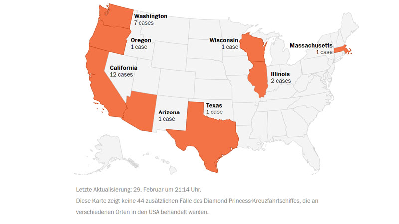 Auch die Washington Post bläst zum Weltuntergang. Betrachtet man die Karte der Corona-Erkrankungen in den USA, so reicht den Kollegen aus Washington offenbar schon 1 Erkrankungsfall, um Bundesstaaten, man siehe hier z.B. Texas, mit einem fahlen Todesrot zu überziehen. Wir reden hier nur von Erkrankten und Verdachtsfällen! Es fällt allerdings auf, dass Staaten, die 2016 „demokratisch“ gewählt haben, deutlich stärker betroffen sind. Ein Schelm, wer Böses dabei denkt.