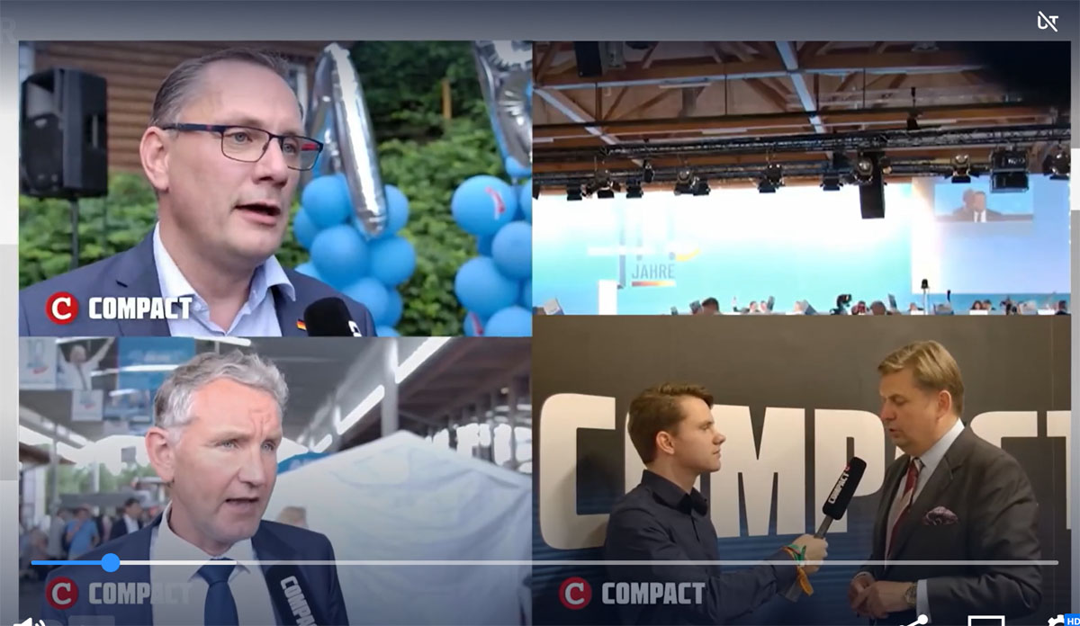 Compact versteht sich seit 2015 als Hausblatt der AfD. Etliche ihrer Politiker sind Autoren, so Maximilian Krah, der an die Seite gedrängte und nun als Kaderreserve geführte Spitzenkandidat für die Europawahl. Ein Hansjörg Müller, ehemals Bundestagsabgeordneter der AfD, führt im Compact-Video-Kanal ein langes Interview mit Marja Sacharowa, der Putin-Getreuen und Sprecherin des russischen Außenministeriums. Der Inhalt ist die übliche Rechtfertigung der russischen Aggression gegen die Ukraine, Angriffe auf die die Bundesrepublik, usw.