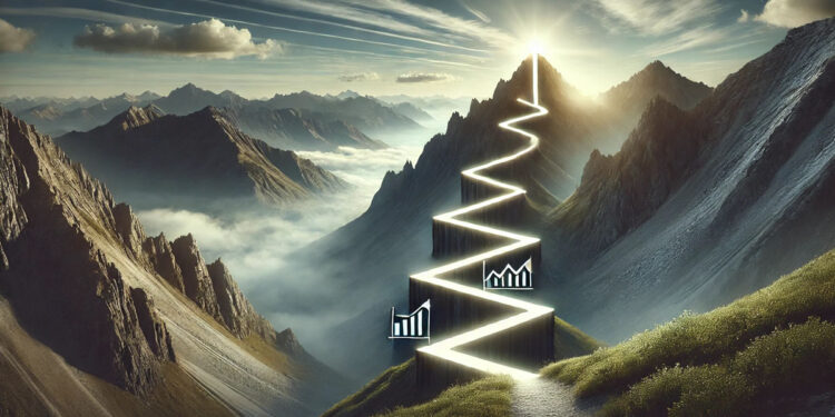 Symbolbild. Steiler Weg zu einem Berggipfel. Links udn rechts sind zwei Business-Grafiken eingeblendet. AI generiert.